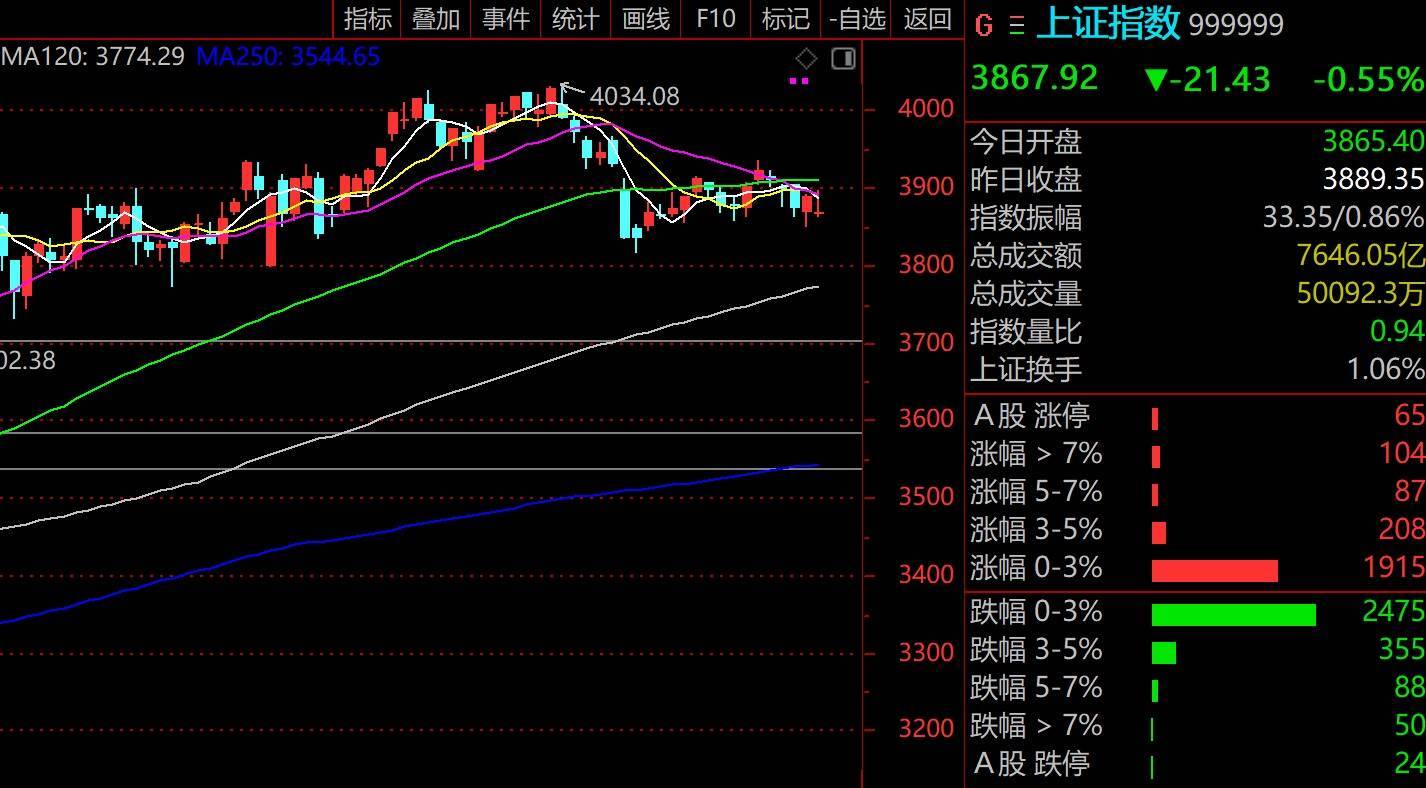 周一,A股在外围利空影响下全线盘整,根据交易所数据,上证指数跌0.55%报3867.92点,深证成指跌1.1%,创业板指跌1.77%,沪深300跌0.63%,科创50跌2.22%。