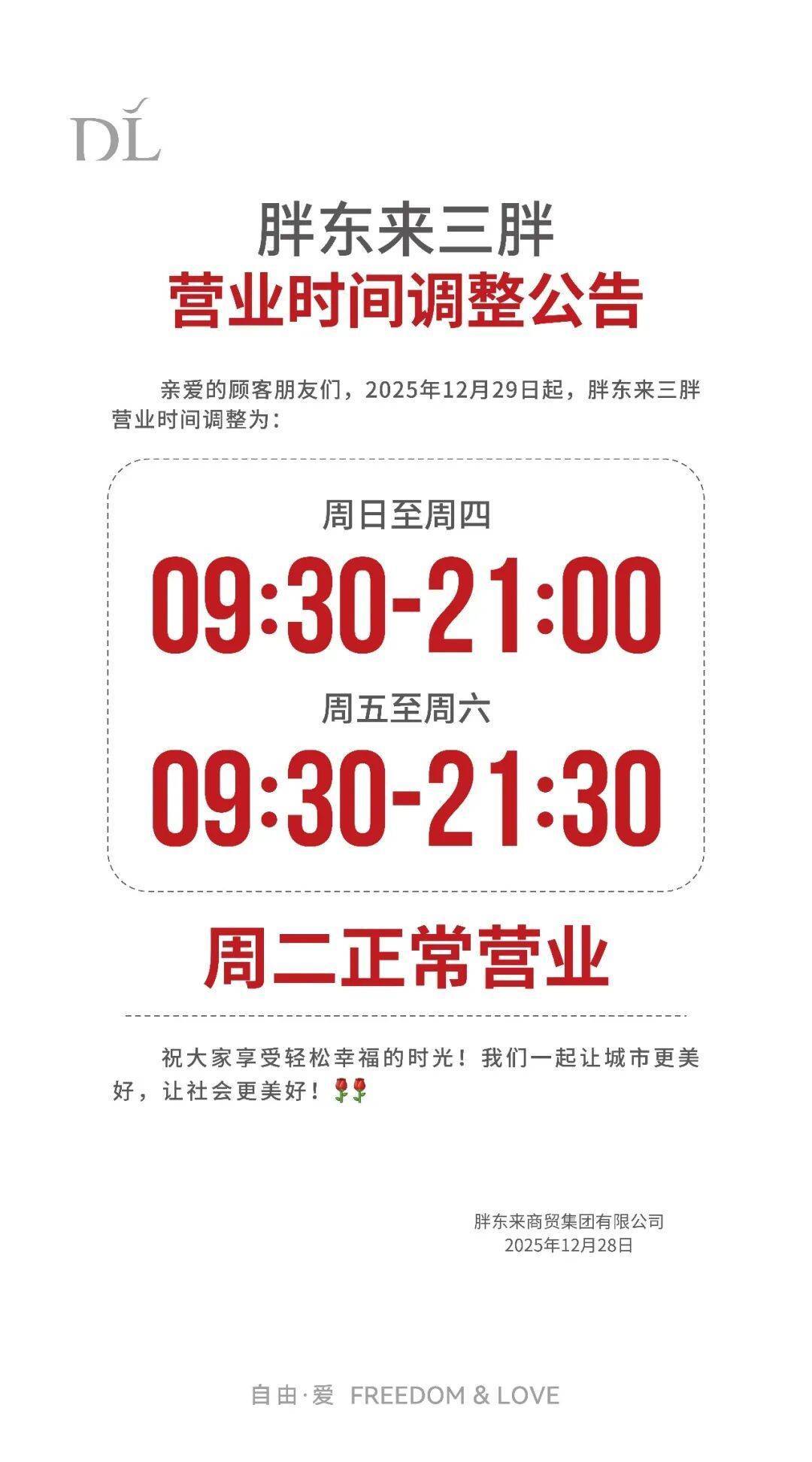 【大河财立方消息】12月28日,胖东来发布公告,宣布胖东来三胖店营业时间将做调整。商场整体营业时间调整为周日至周四9:30~21:00,周五至周六为9:30~21:30,周二正常营业。