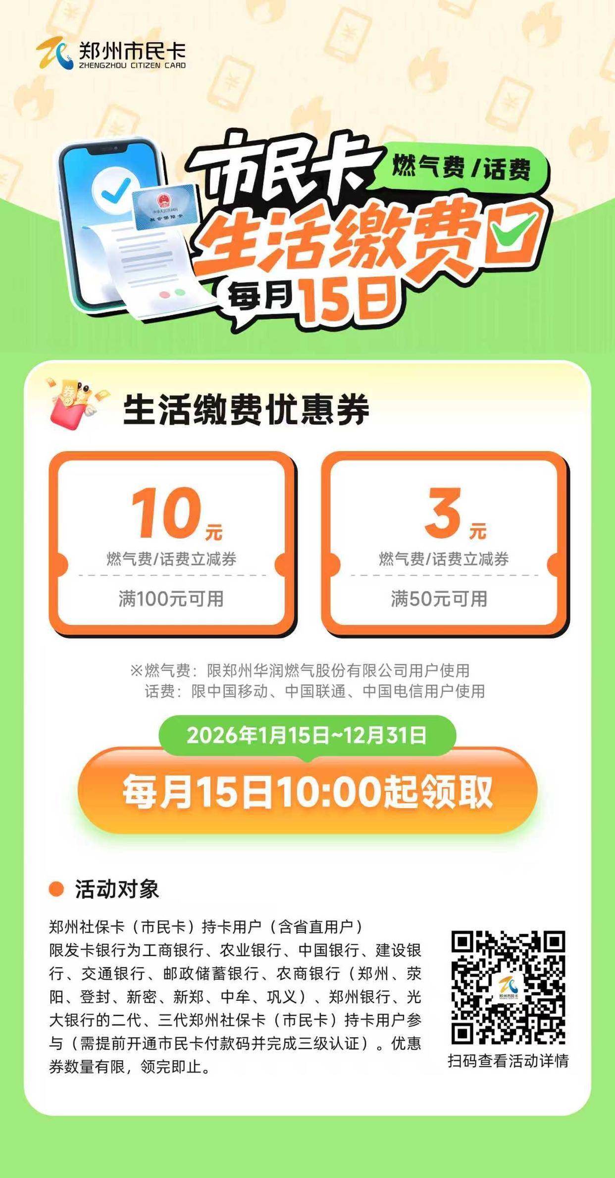 1月14日,记者从郑州市人社局了解到,2026年“生活缴费日”活动将于明日(1月15日)10点起正式开始,据了解,该活动将贯穿全年,2026年每个月的15日上午10点起面向郑州社保卡(市民卡)用户(含省直)发放燃气费、话费优惠券,持卡用户可通过郑州市民卡APP参与领取。