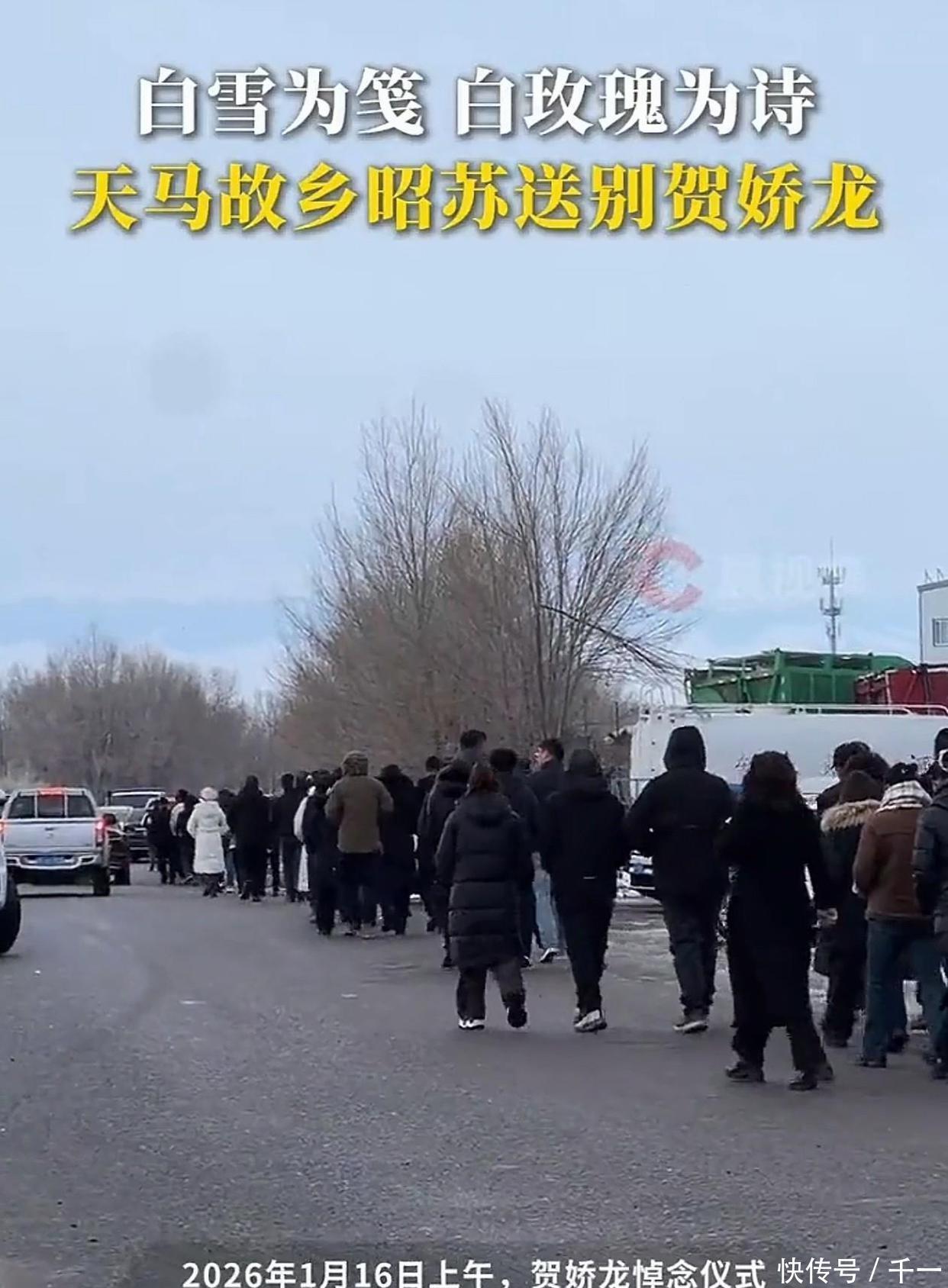 1月16日,贺娇龙的追思会在昭苏殡仪馆举行,媒体报道显示,这场追悼会是由昭苏县人民政府和家属一块儿筹办的。有网友发现天未亮的时候,殡仪馆附近的路上就已经停满了不少车辆,都是开着灯,排了好几公里。有人注意到,16天一大早,天已经冷到-8℃,可是还是有不少市民陆续赶过去,陪着贺娇龙告别。