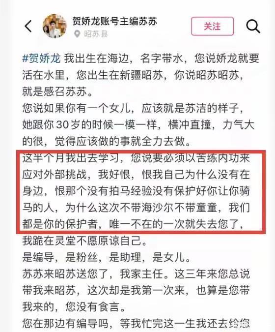贺娇龙的社交账号的主编苏苏也难过得不得了,她还说呢,那段时间自己正好去外面学习了,现在回想起来,真是挺后悔当时没能陪在贺主任身边。她自己也说了,这些年一直陪在贺主任身边,没想到这次一别竟变成永远,现在还觉得难以原谅自己。